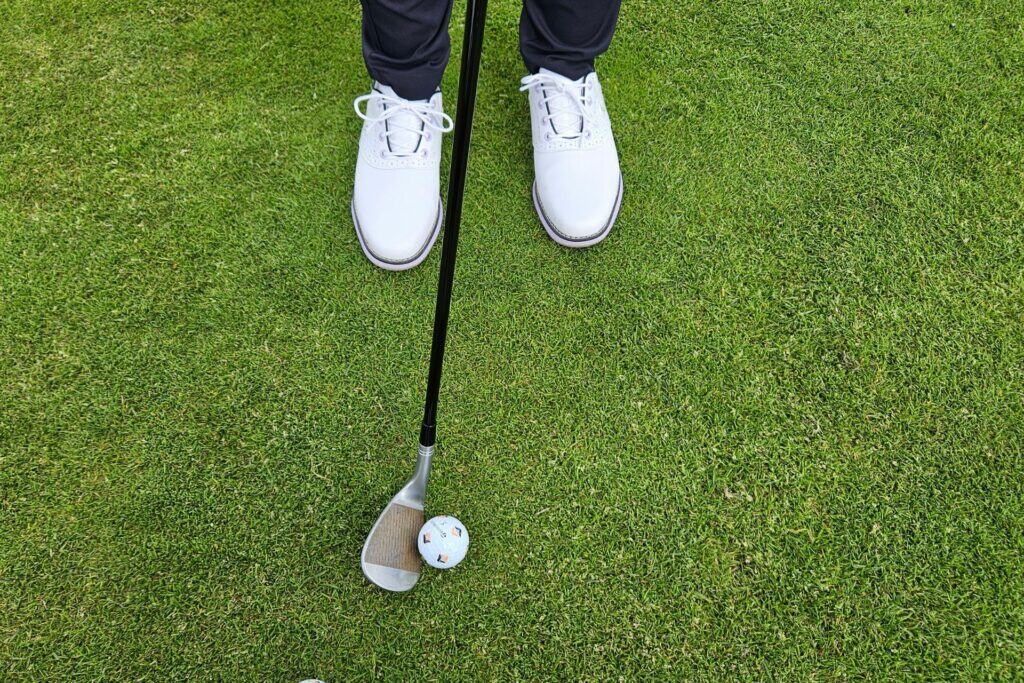 Remember – ball towards the back foot means that the ball will fly out lower and have more roll, whilst having the ball towards your front foot means you increase the loft, the ball will fly higher and have less roll.