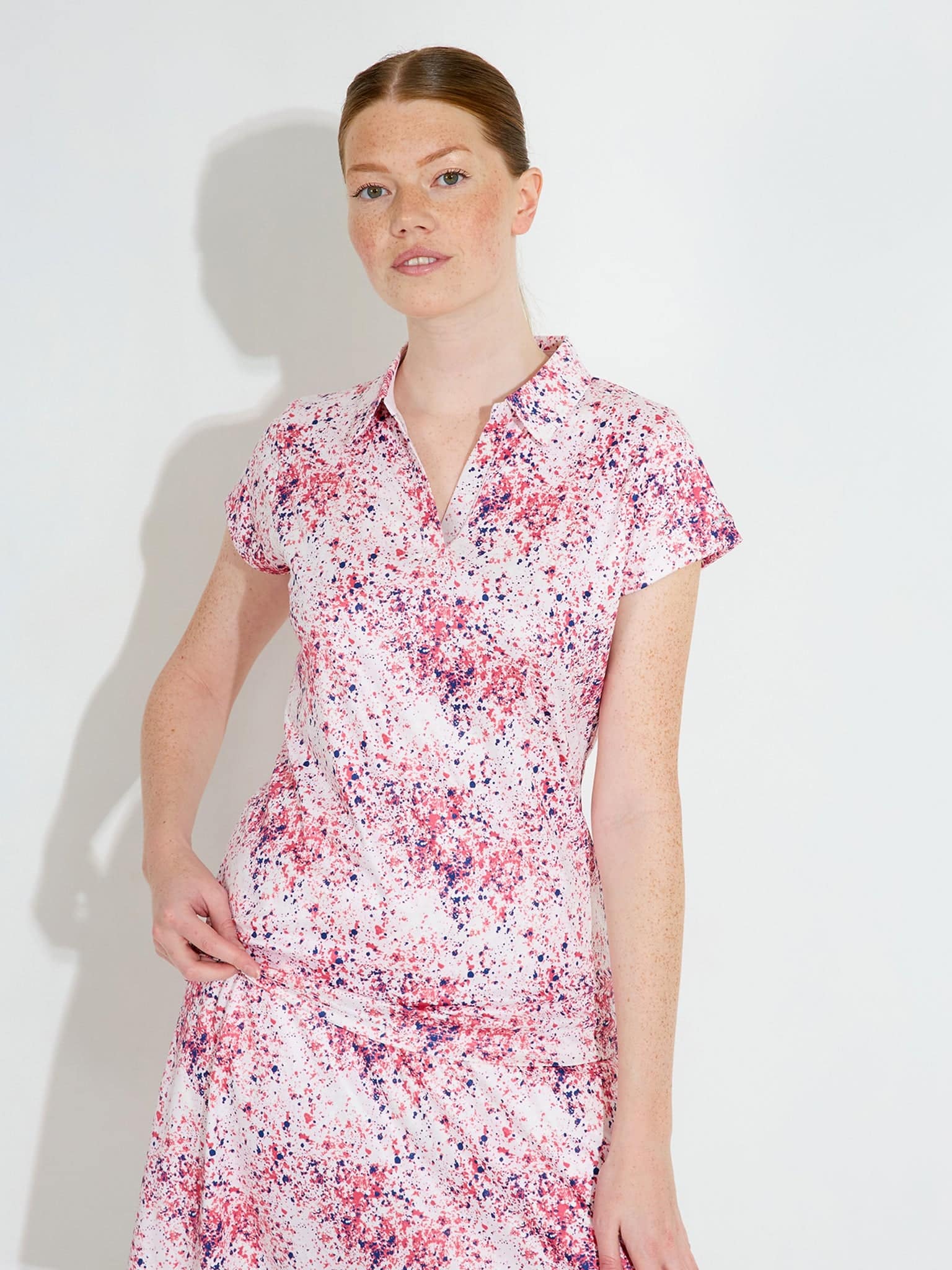 This cupsleeve top features an all-over pattern and buttonless V-neck design. The stretchy recycled polyester fabric includes moisture-wicking technology for comfortable wear throughout the day.