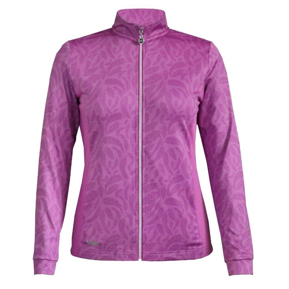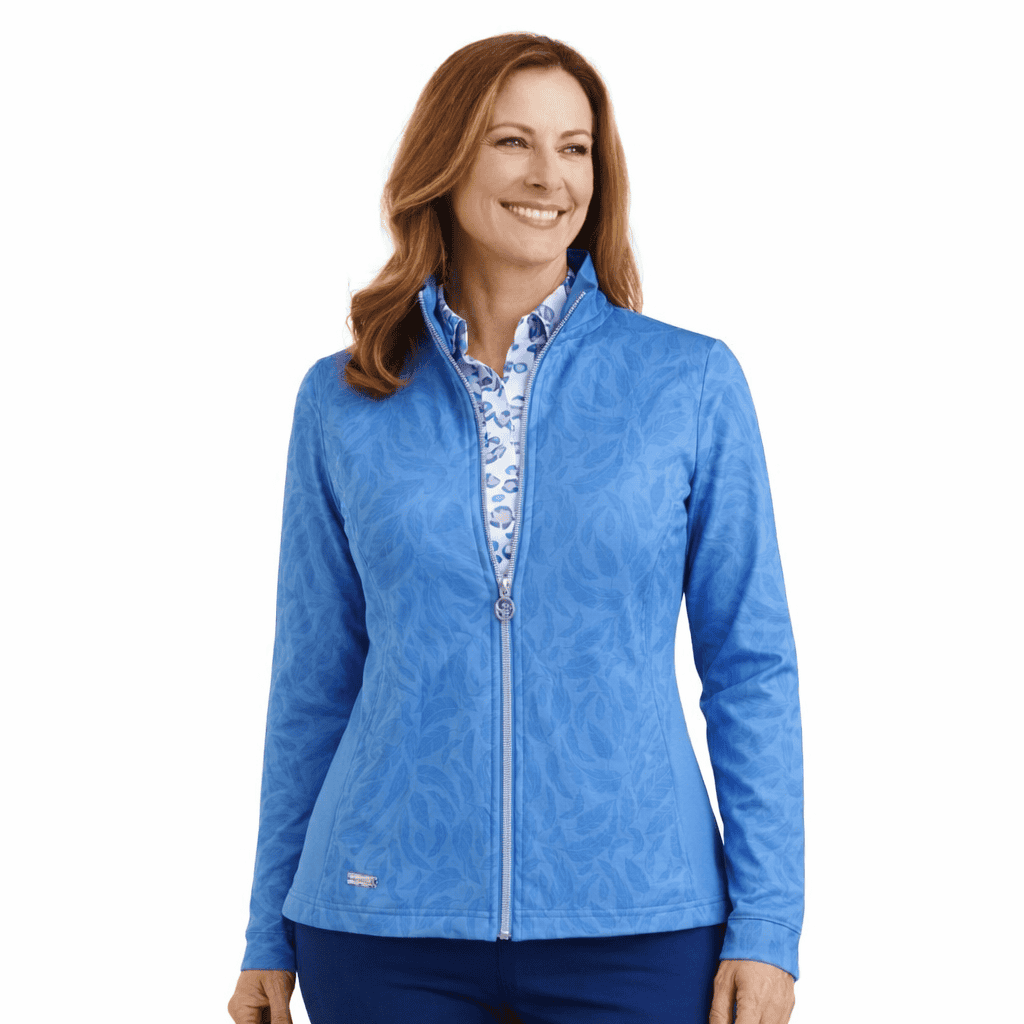This golf top combines comfort and performance with a distinctive feather print design. The stretch fabric and brushed interior make it suitable for active wear on the course or casual everyday use. A full-length zip allows easy temperature adjustment throughout your round.