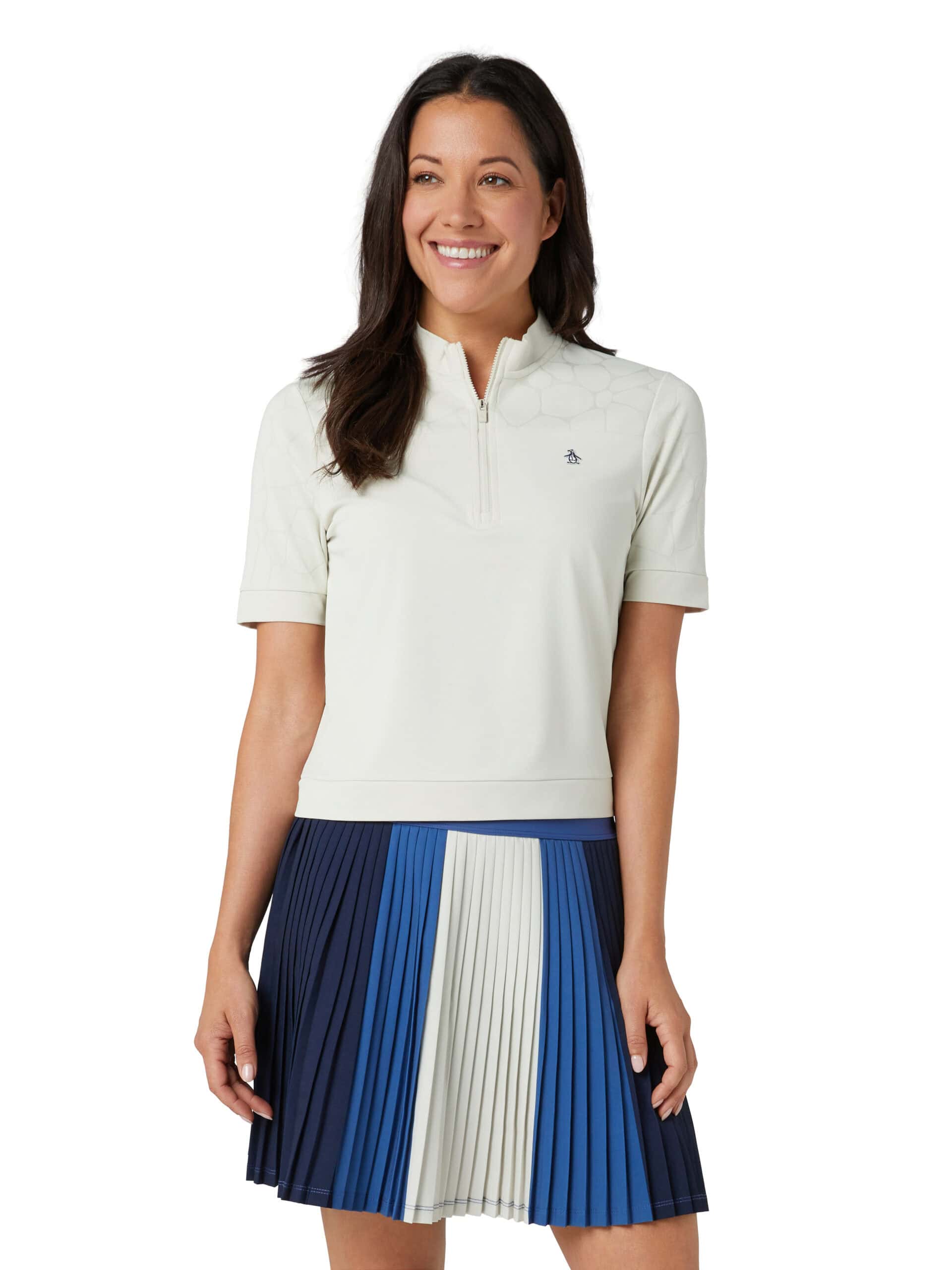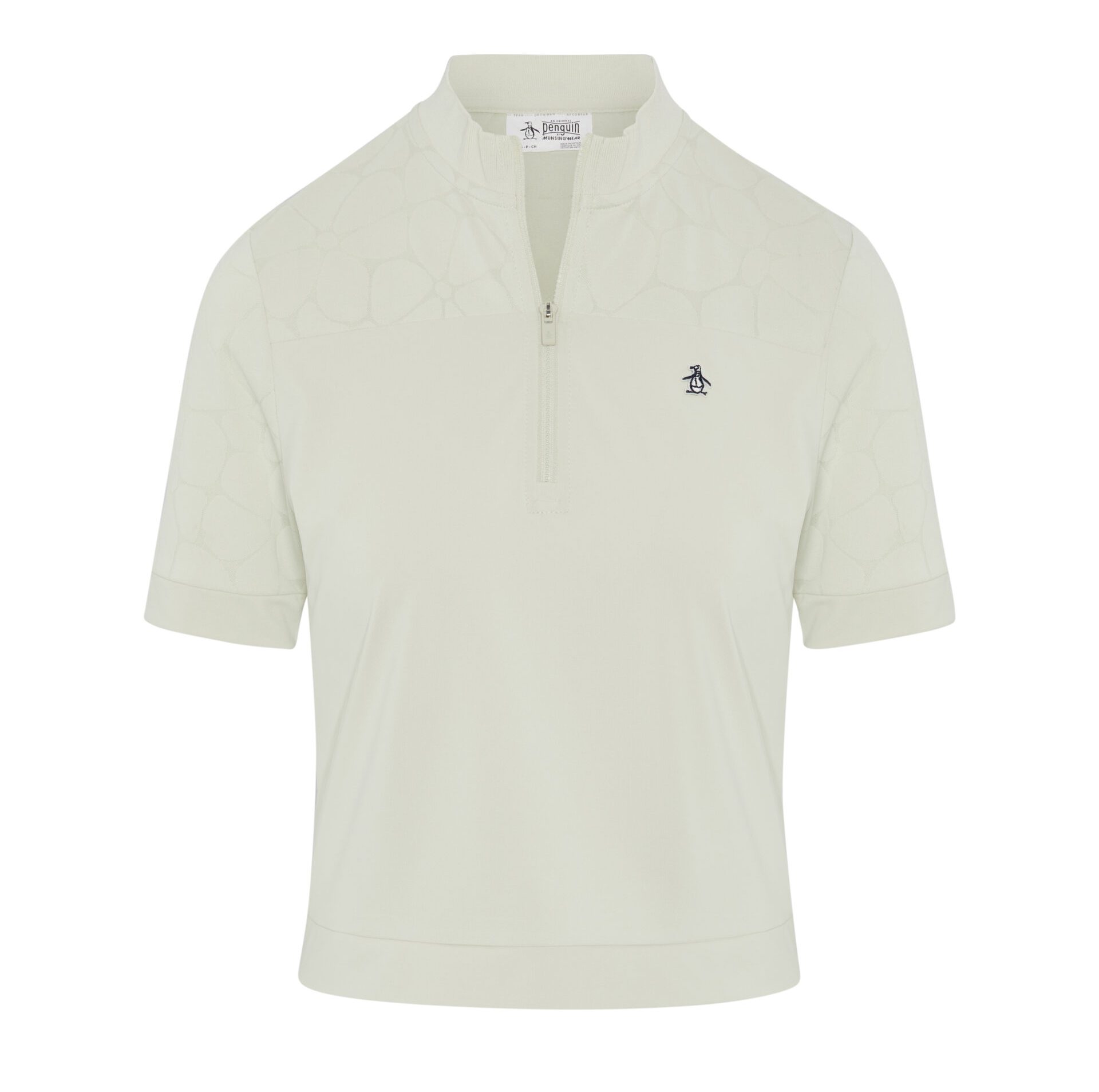 A laser cut floral design and classic mock neck make this shirt a sophisticated style choice, made from 44% recycled polyester. The flexible top is made from a lightweight single knit fabric and is enhanced with stretch, and its moisture-wicking technology keeps you feeling fresh.