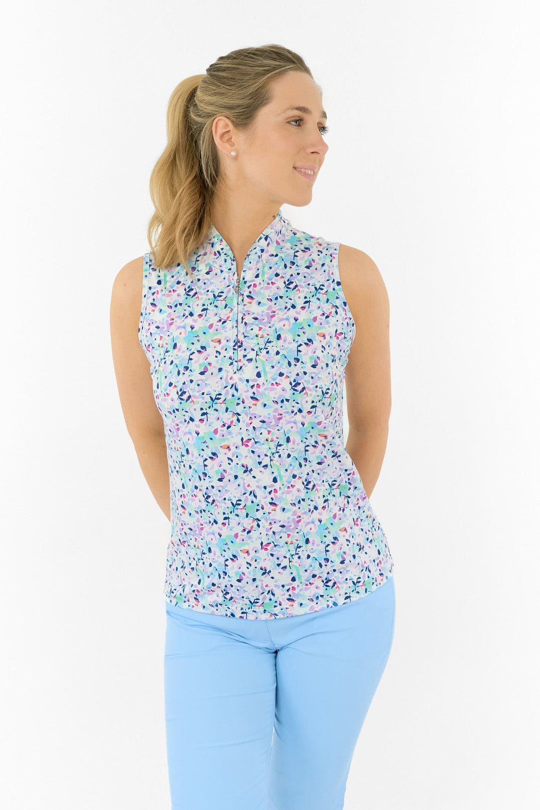 This sleeveless polo combines lightweight comfort with a sophisticated silhouette for active days. The Mirrored Moonstone design features soft pastels and scattered abstract shapes that create a dreamy, water-like reflection pattern. Built from a polyester-elastane blend that moves with you while maintaining its crisp appearance.