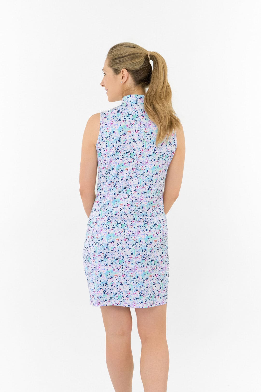 This sleeveless golf dress combines performance and style with its mock neck design and flattering silhouette. The Mirrored Moonstone pattern features soft pastels and abstract shapes that create a dreamy, water-like reflection. Built for both comfort and function on the course.