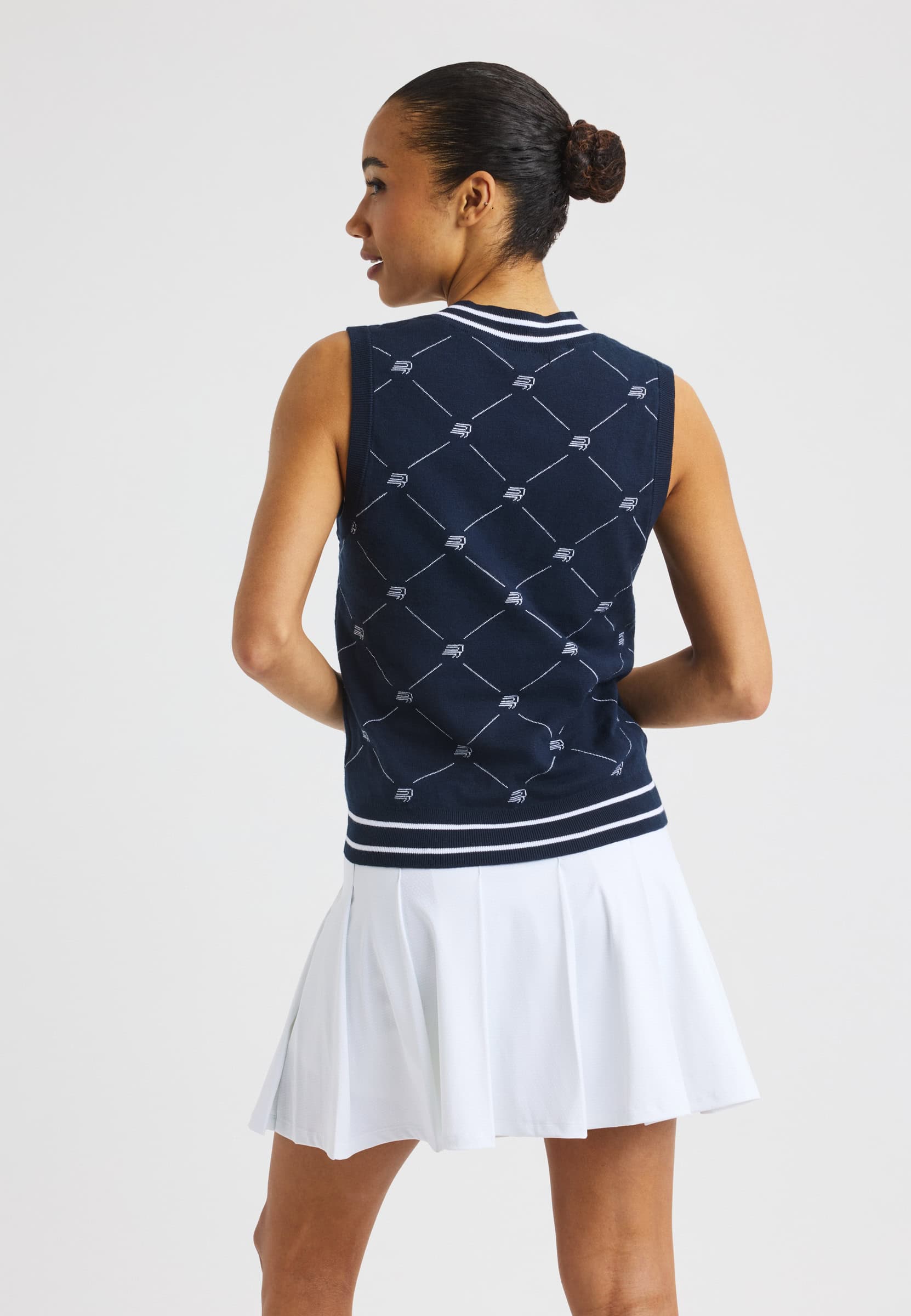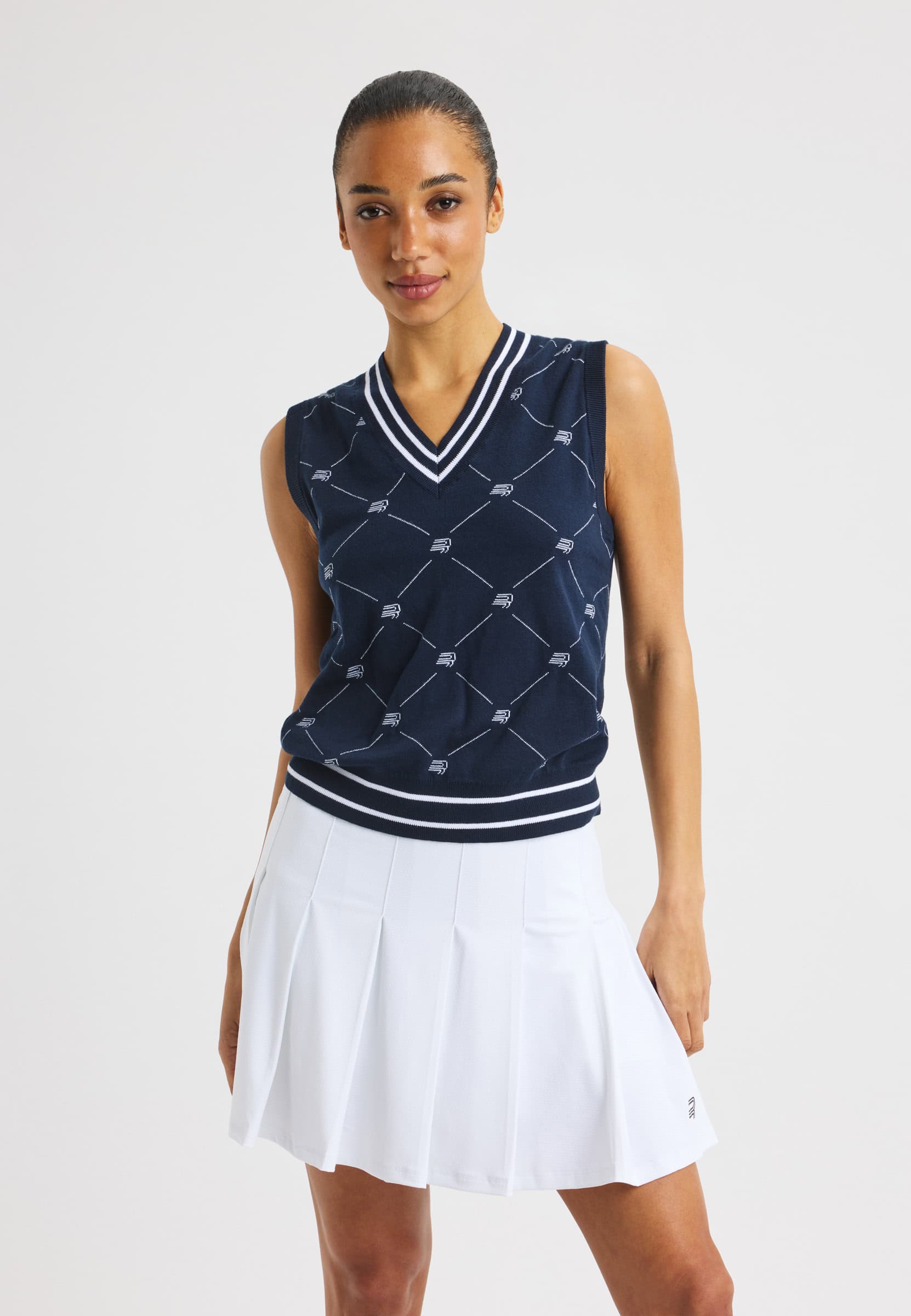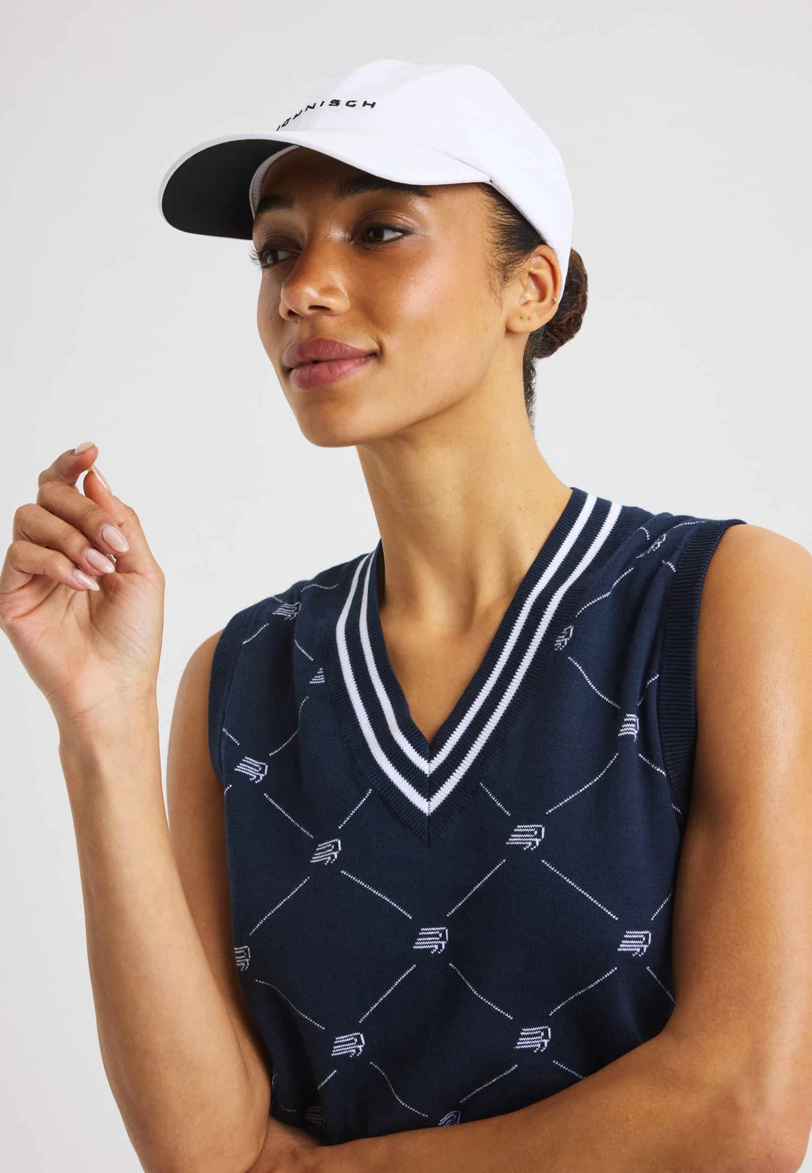 The R Logo Vest is a classic knitted golf vest with a clean, preppy look suitable on and off the course. Made from a soft blend of 70% organic cotton and 30% combed cotton, it offers comfort and quality in a regular-fit silhouette. Finished with a jacquard-knit Röhnisch pattern, this sustainable piece comes in a Navy Blue checkered design and sizes XXS–XXXL.