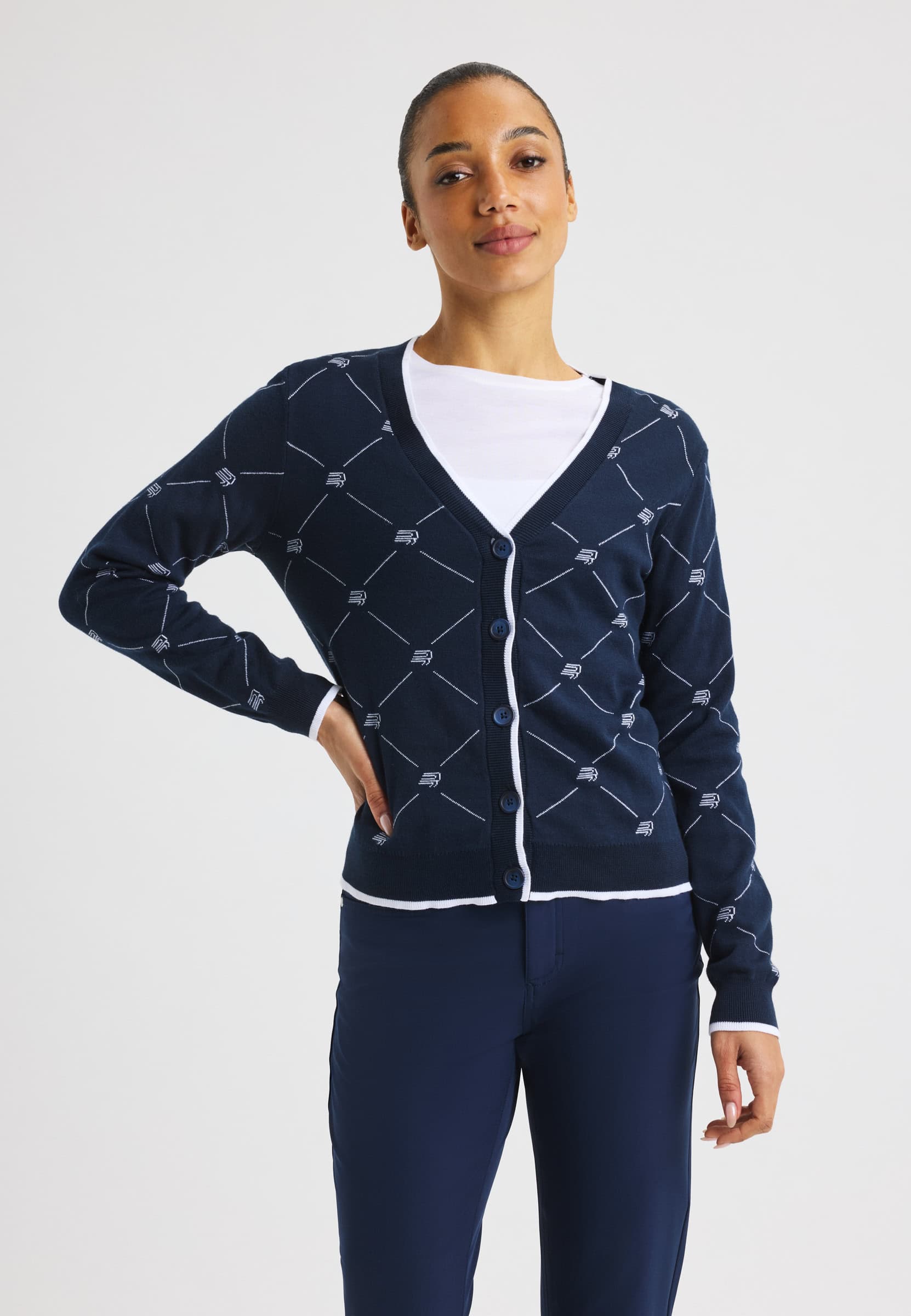 A classic knitted golf cardigan designed for a timeless, preppy look on and off the course. Made from a soft blend of organic and combed cotton, it offers comfortable wear with a refined finish. Featuring a classic button closure and a jacquard-knit Röhnisch pattern, this regular-fit cardigan is a fully sustainable choice.